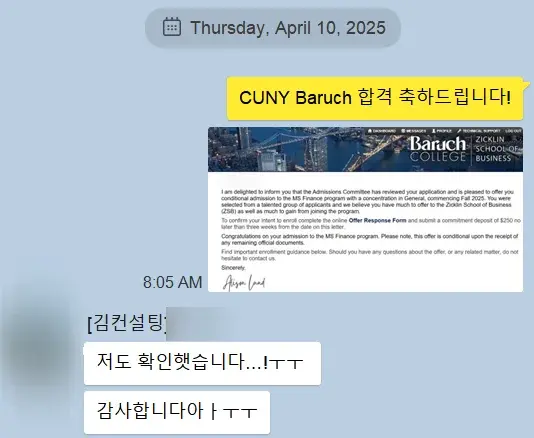 The student was admitted to the Master of Science (MS) in Finance program at Baruch College’s Zicklin School of Business (CUNY) for Fall 2025.