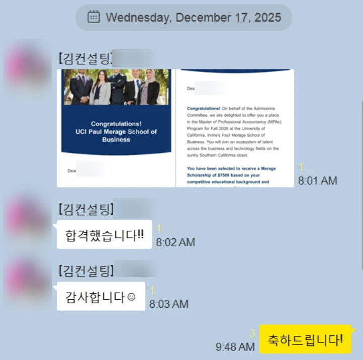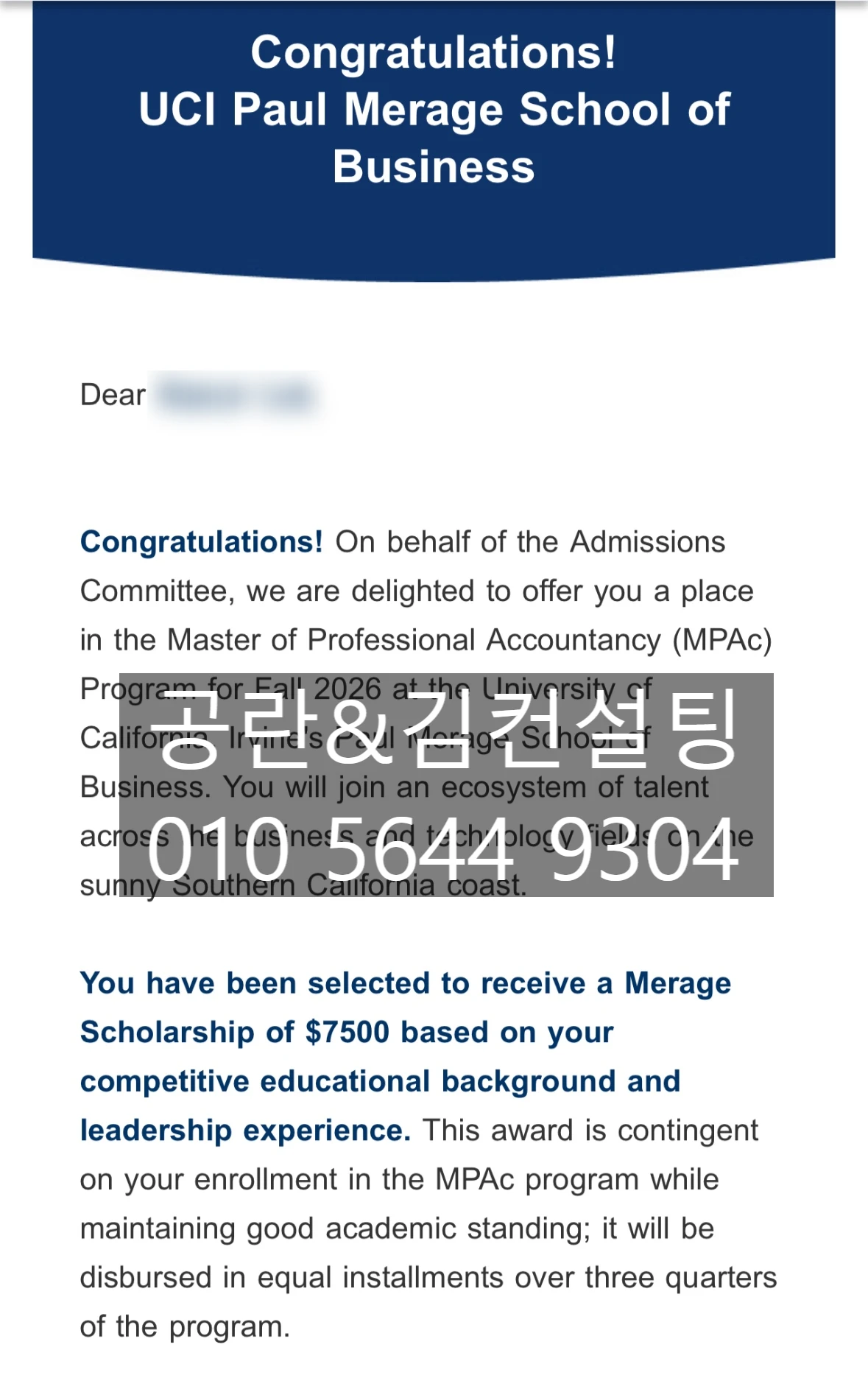 Kim Consulting is proud to announce that one of our clients has been admitted to the Master of Professional Accountancy (MPAc) program at the Paul Merage School of Business, University of California, Irvine, with a $7,500 merit-based scholarship.