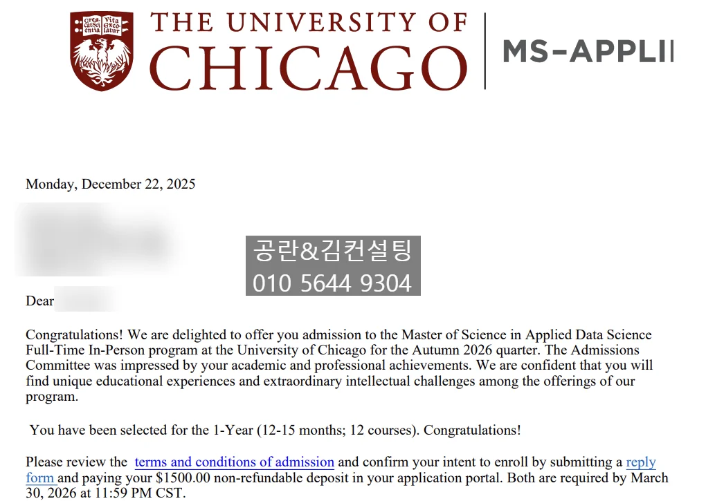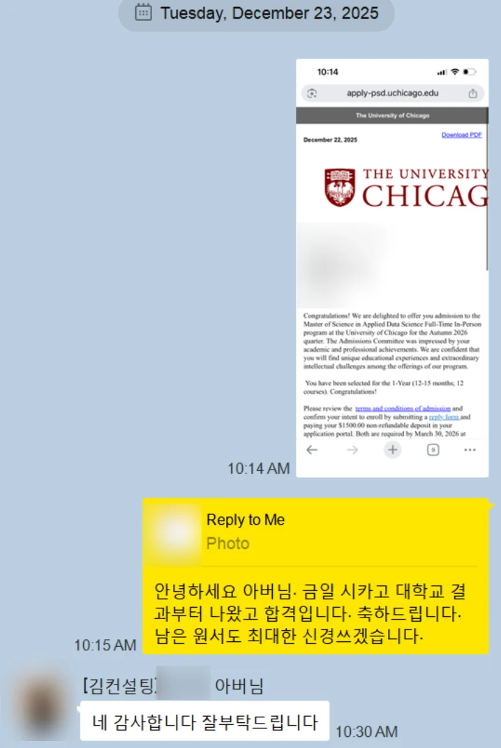 UChicago’s MS in Applied Data Science is known for its selective admissions process and focus on intellectual fit. This result highlights the importance of a coherent narrative and school-specific positioning in competitive STEM master’s admissions.