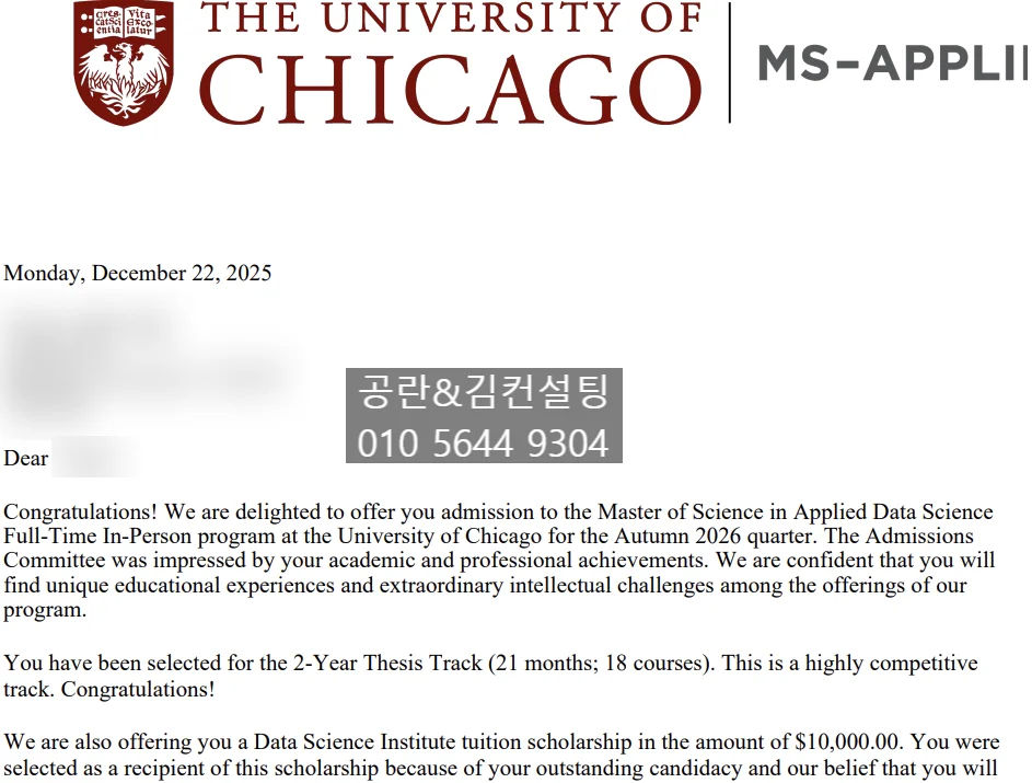 We are pleased to share a successful admission and scholarship outcome for one of our applicants to the Master of Science in Applied Data Science program at University of Chicago for Fall 2026.
