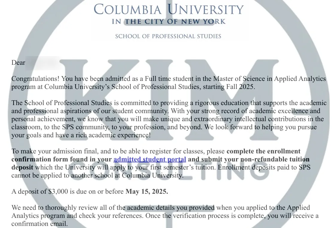 Kim Consulting is pleased to share that one of our students has been admitted to the Master of Science in Applied Analytics program at Columbia University SPS for Fall 2025.