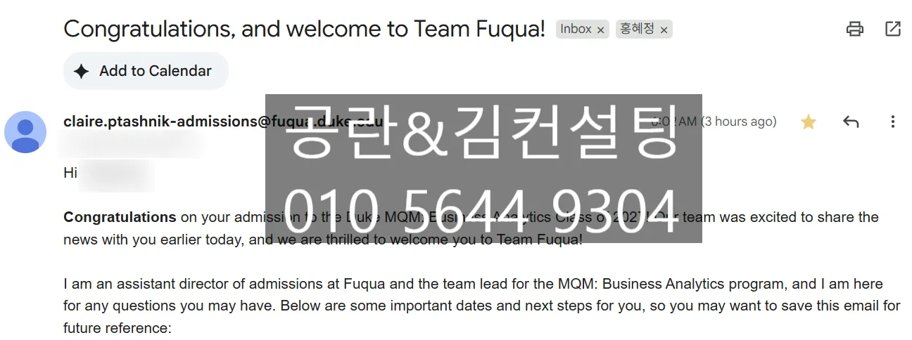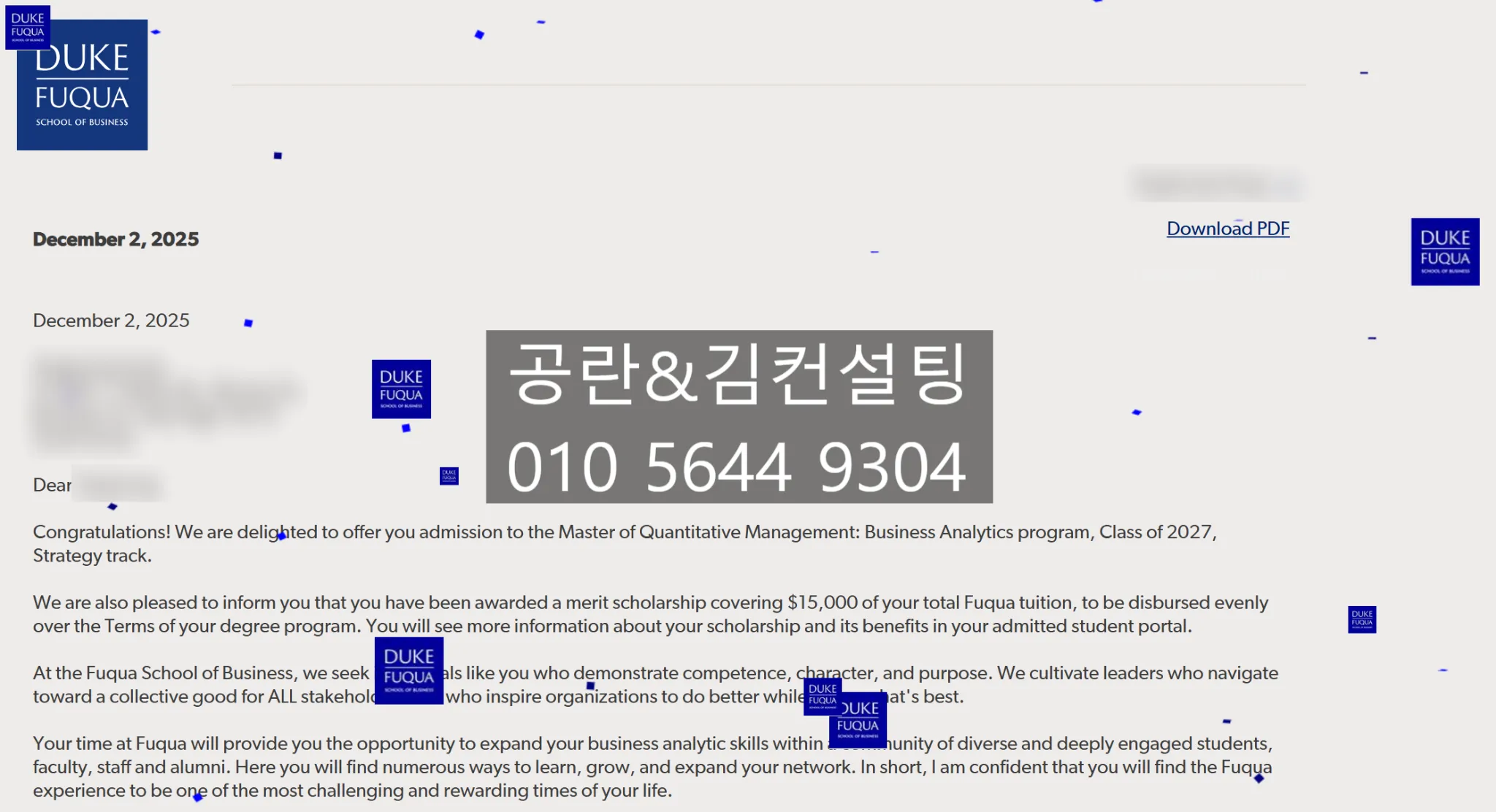 One of our applicants has been admitted to the Duke University – Fuqua School of Business Master of Quantitative Management (MQM): Business Analytics – Strategy Track, along with a $15,000 merit scholarship. This scholarship amount is among the highest we have seen for the MQM program in recent cycles, making this result especially noteworthy.
