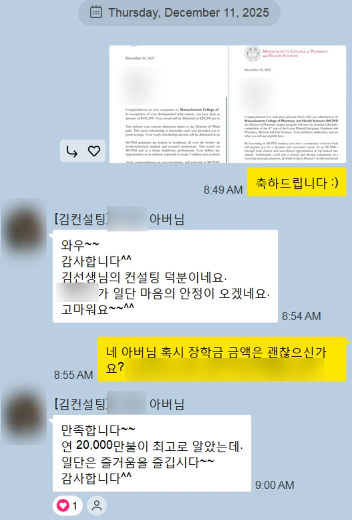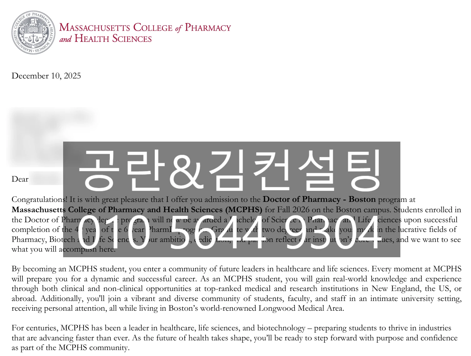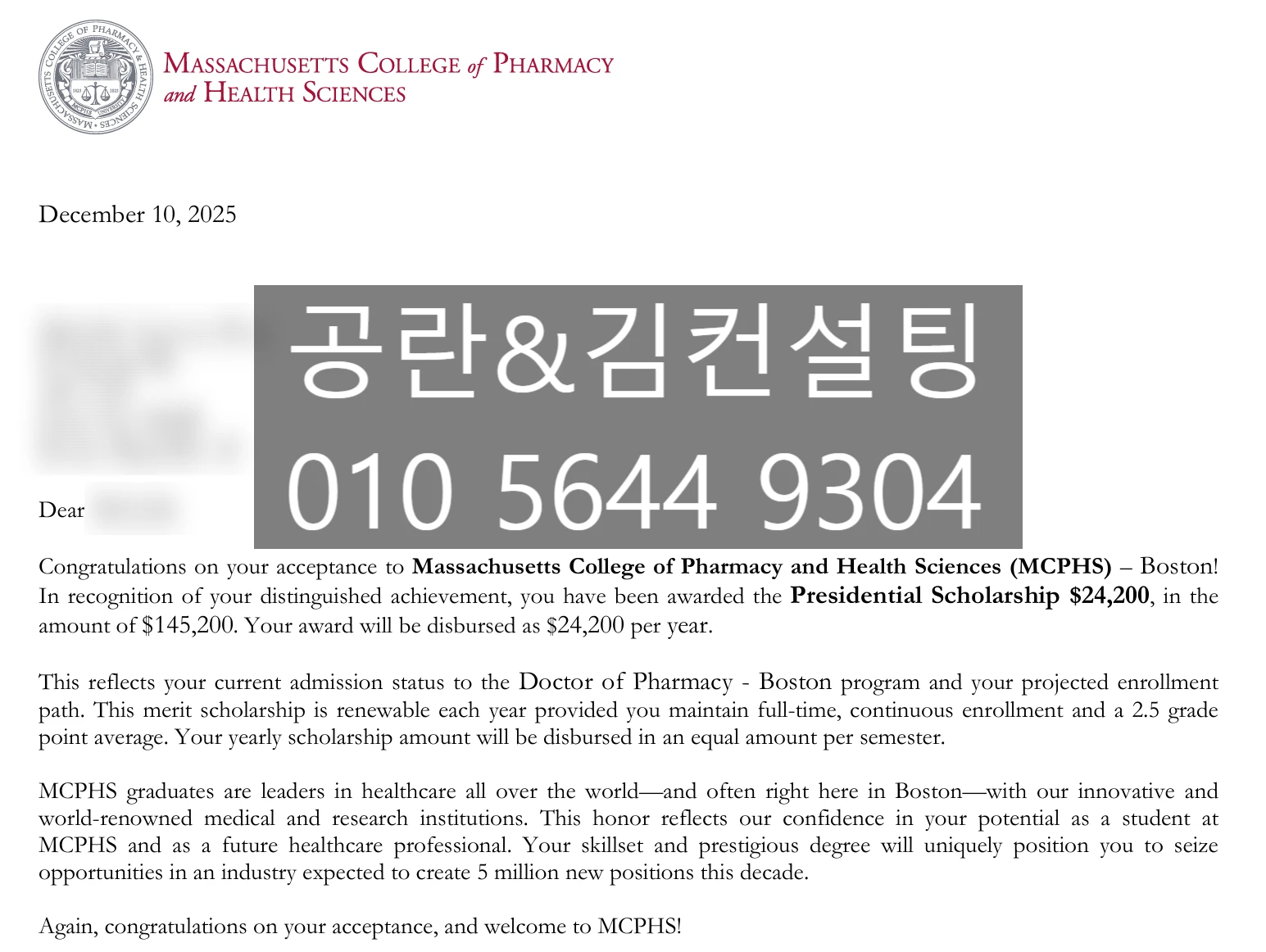 We are delighted to announce that one of our students at Kim Consulting has been admitted to the Doctor of Pharmacy (PharmD) program at MCPHS University in Boston. In addition to admission, the student has been awarded the Presidential Scholarship of $24,200 per year, recognizing exceptional academic promise and dedication to the field of pharmacy.