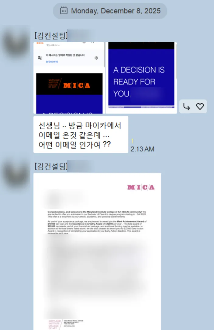We are excited to announce that a Kim Consulting student has been admitted to the Maryland Institute College of Art (MICA) for the 2026 Fall Bachelor of Fine Arts (BFA) program — along with a highly competitive $22,000 per year scholarship award.