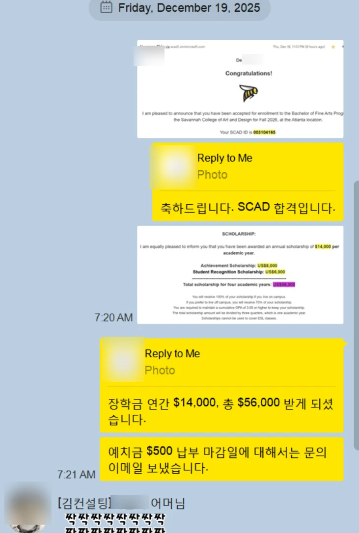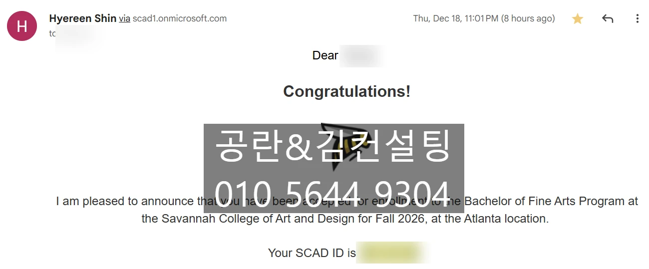A Kim Consulting student has been admitted to theBachelor of Fine Arts (BFA) program at Savannah College of Art and Design (SCAD) for Fall 2026, Atlanta campus, with a merit-based scholarship.
